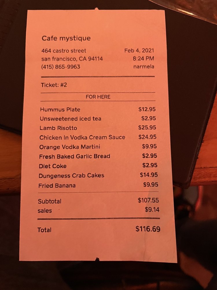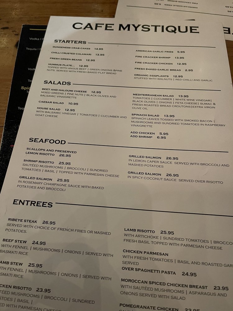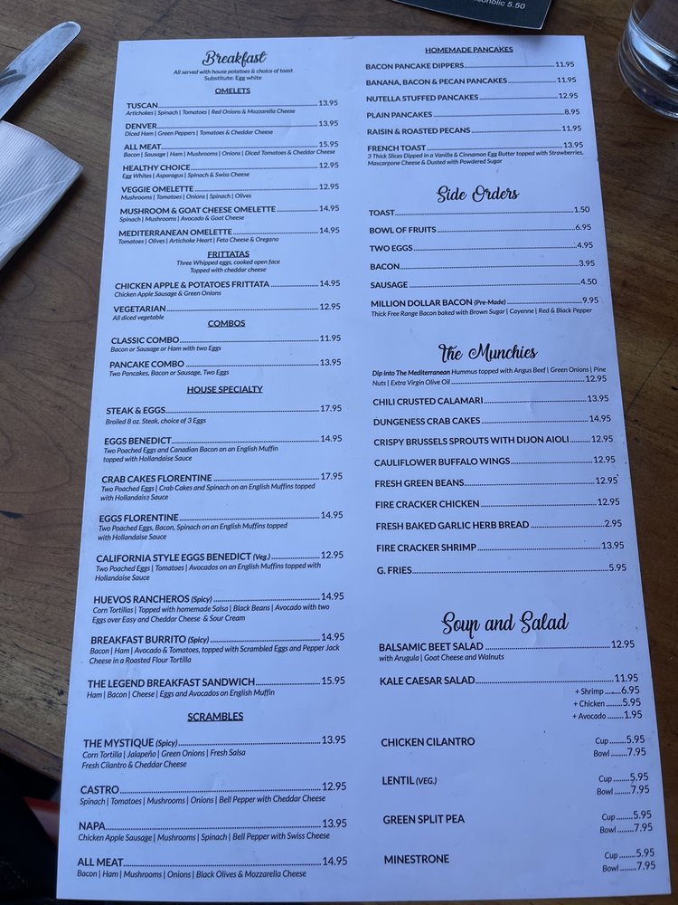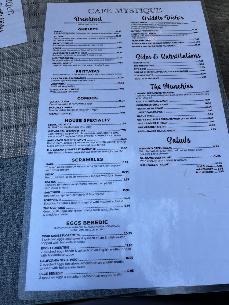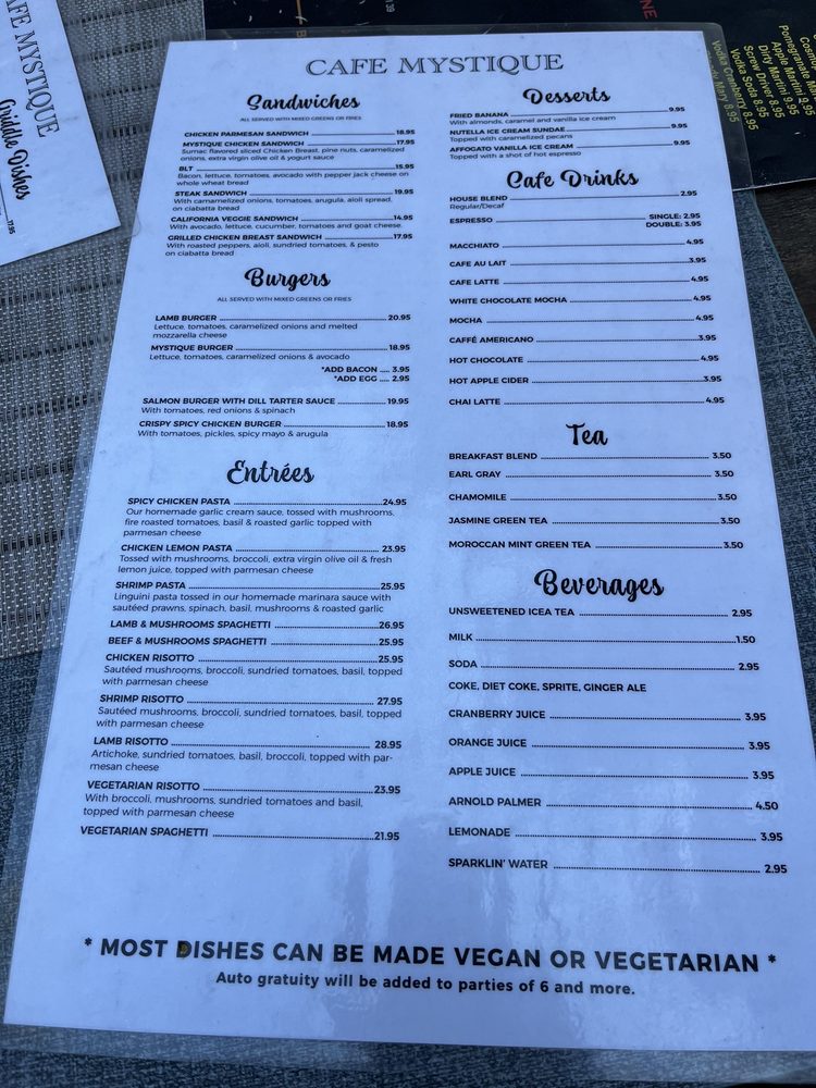 Located in San Francisco, Cafe Mystique offers a diverse menu featuring burgers, Mediterranean dishes, and breakfast favorites. With options for vegan and vegetarian diners, as well as ample seating and various amenities, this restaurant caters to a wide range of customers. The breakfast menu boasts flavorful omelets, frittatas, and combo meals, showcasing dishes like Tuscan Artichoke Omelet and Chicken Apple & Potatoes Frittata. Customer reviews rave about the quality of the food, especially highlighting the delicious French toast, perfectly cooked steak, and flavorful garlic bread. While some reviewers find the dishes to be enjoyable but not exceptional, the overall atmosphere and service of Cafe Mystique receive high praise. Whether you're in the mood for a satisfying breakfast or a tasty lunch, this restaurant in the Castro district is worth a visit.
